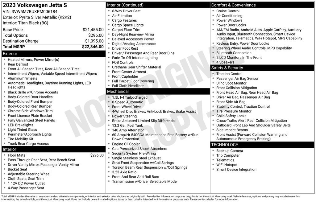 Backed by Volkswagen's renowned reputation for quality and reliability, this 2023 Jetta 1.5T S is a smart investment that will serve you well for years to come. With its exceptional performance, impressive fuel economy, and impressive list of features, this Jetta is the perfect blend of style, practicality, and value.